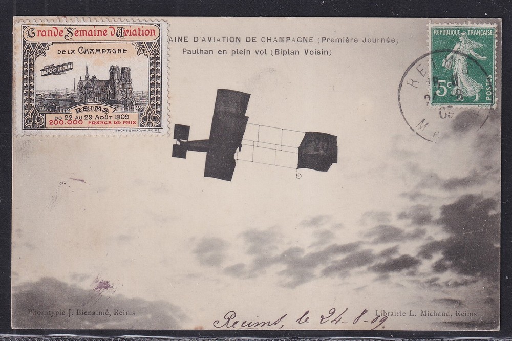 FRANCIA 1909 SEMANA DE LA AVIACION TARJETA POSTAL DE AVION CON VIÑETA CIRCULADA S241224XSO